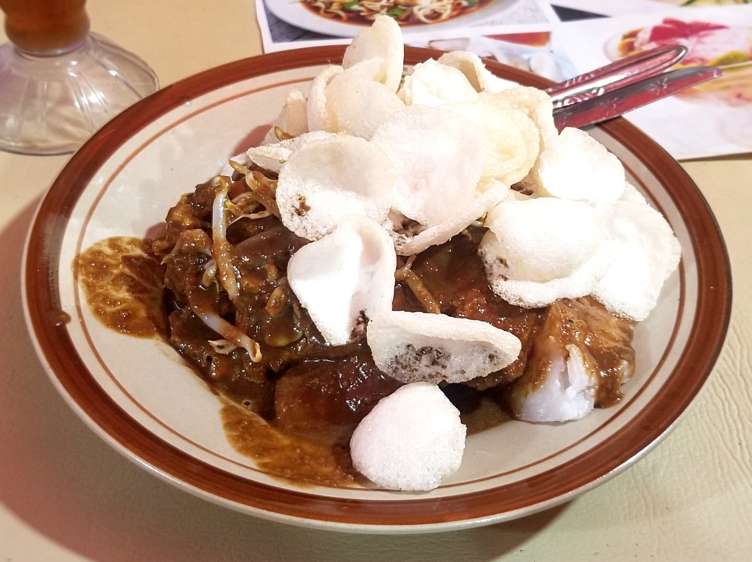 The dish consists of tofu (tahu), compressed rice cake (lontong), peanut sauce (bumbu kacang), and bean sprouts (tauge). You may also find vegetables such as red cabbage (kol merah), carrot (wortel), or celery (seledri) included in the dish as well. The tofu used is the silken kind – soft and creamy, not extra firm. It can be in a single omelet or many small and flat omelet, depending upon where you buy it. Tahu telor is often offered by street vendors peddling carts or managing stalls. The recipe, and even the nickname, can vary greatly across regions or even across cities, and tahu telor can be eaten for any meal of the day.