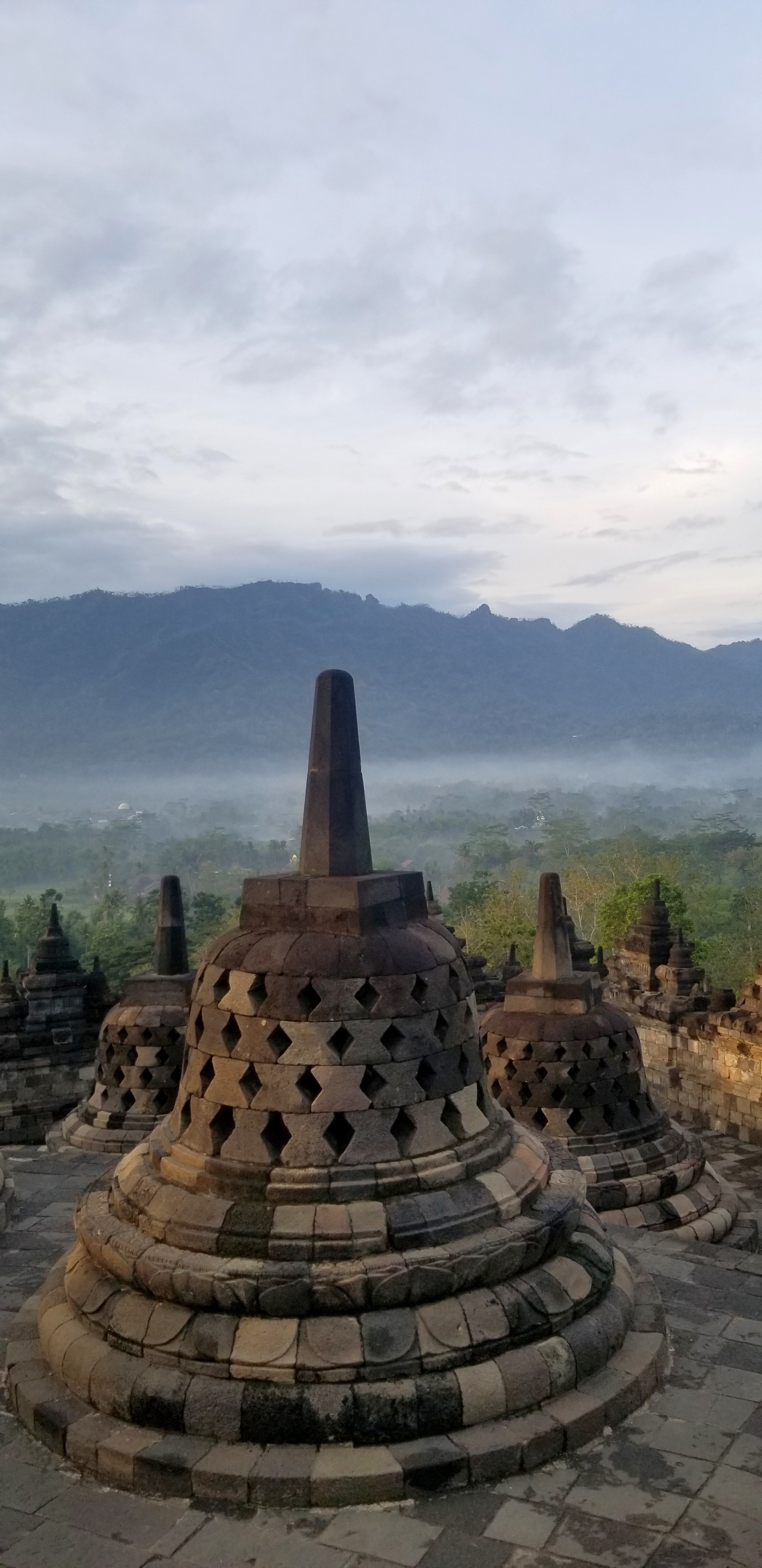 The mist from the hills surrounding Borobudur Temple can be seen beyond the tiered, rhombus-holed stupas of the upper second and third platforms.
