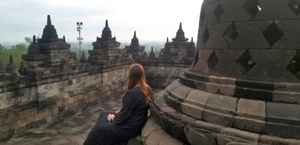 The best place to watch the sunrise is from the top of Borobudur Temple. Climb to one of the top three stacked platforms, which are circular in nature. There are 72 Buddha statues across these levels, each enshrined in an individual stupa, that surround a larger, central stupa. Even if you don’t experience a vivid, colorful sunrise (we certainly didn’t), the experience is still worth the effort! You can still explore the entire temple once the sun is up, and the early-morning mist rising from the surrounding hills creates an ethereal atmosphere.