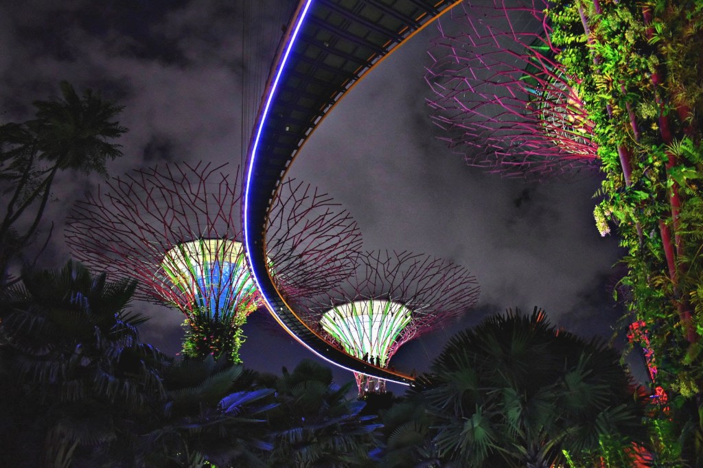 The OCBC Skyway from below at nighttime.