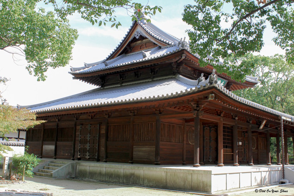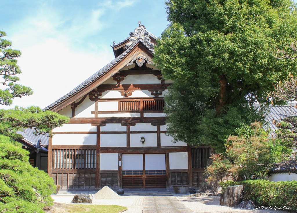 Joten-ji Temple was built in 1242. The addition of a modern city street through the center of the temple’s grounds, constructed as part of a city zoning project, has split the site into eastern and western sections. The temple, also known as Banshosan, is of the Rinzai school of Tofukuji Buddhism. On-site, Buddhist statues an a Korean copper bell are considered to be important national properties in Japan. On the temple’s grounds are a number of gardens, including a well-maintained zen garden, although the latter is often closed to visitors.